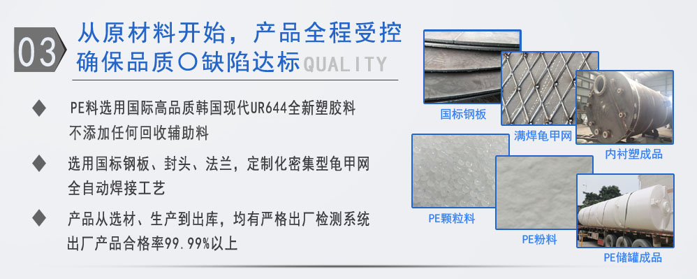 公司有鋼襯塑PE/PO、PE全塑、碳鋼、不銹鋼四大系列100多個(gè)品種,專(zhuān)注于常壓儲(chǔ)存容器生產(chǎn),其產(chǎn)品包括鋼襯塑儲(chǔ)罐、管口一體成型PE儲(chǔ)罐、碳鋼儲(chǔ)罐、不銹鋼儲(chǔ)罐、反應(yīng)釜、攪拌罐、離子交換柱、鋼襯PE/PO儲(chǔ)罐、塑料儲(chǔ)罐、鹽酸儲(chǔ)罐、硫酸儲(chǔ)罐等等。更大限度滿(mǎn)足廣大客戶(hù)的各種需求,同時(shí)可以根據(jù)客戶(hù)的需要加工定制各種防腐設(shè)備。